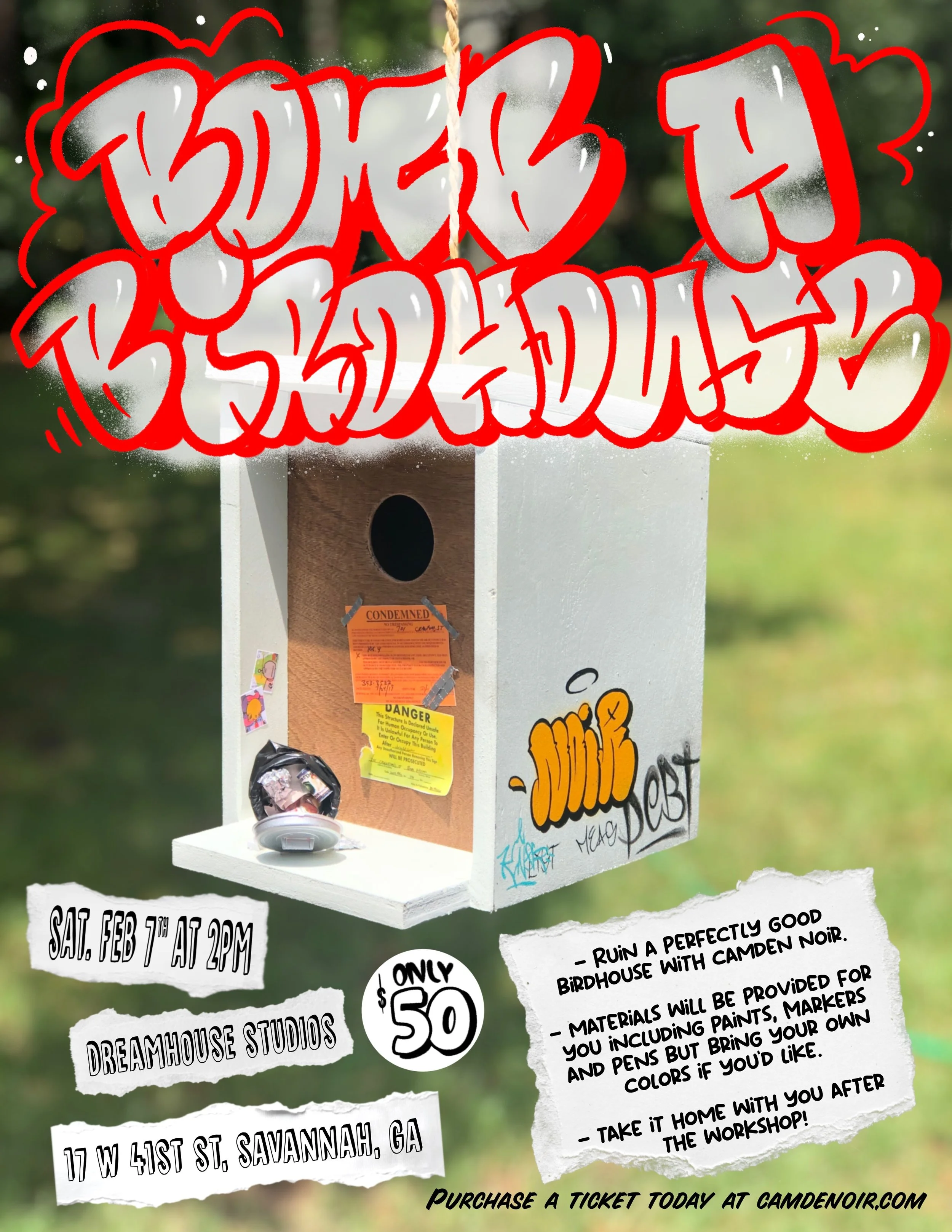 Camden Noir will lead a two-hour workshop where you get the chance to destroy a birdhouse with graffiti. Noir has been building “abandoned” birdhouses since Covid, and will conduct miniature workshops to anyone who is interested.