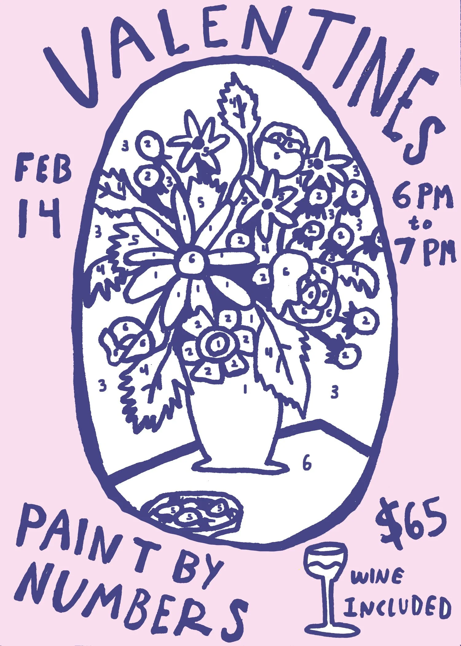 Calling all lovers and galentines! We have the perfect V-Day activity for you. Join us for a special Paint-by-Numbers workshop led by Allison of Small Creative! You’ll get to choose between three 5x7” pieces to paint as you sip, relax, and follow the numbers. This is the perfect pre-dinner addition to your Valentines Day!