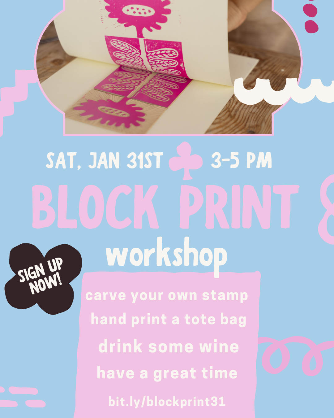 In this workshop, you will learn the basics of block printing, have the opportunity to carve your own design, and print on a cotton or canvas tote bag to take home.